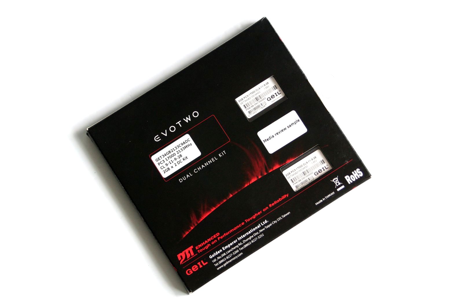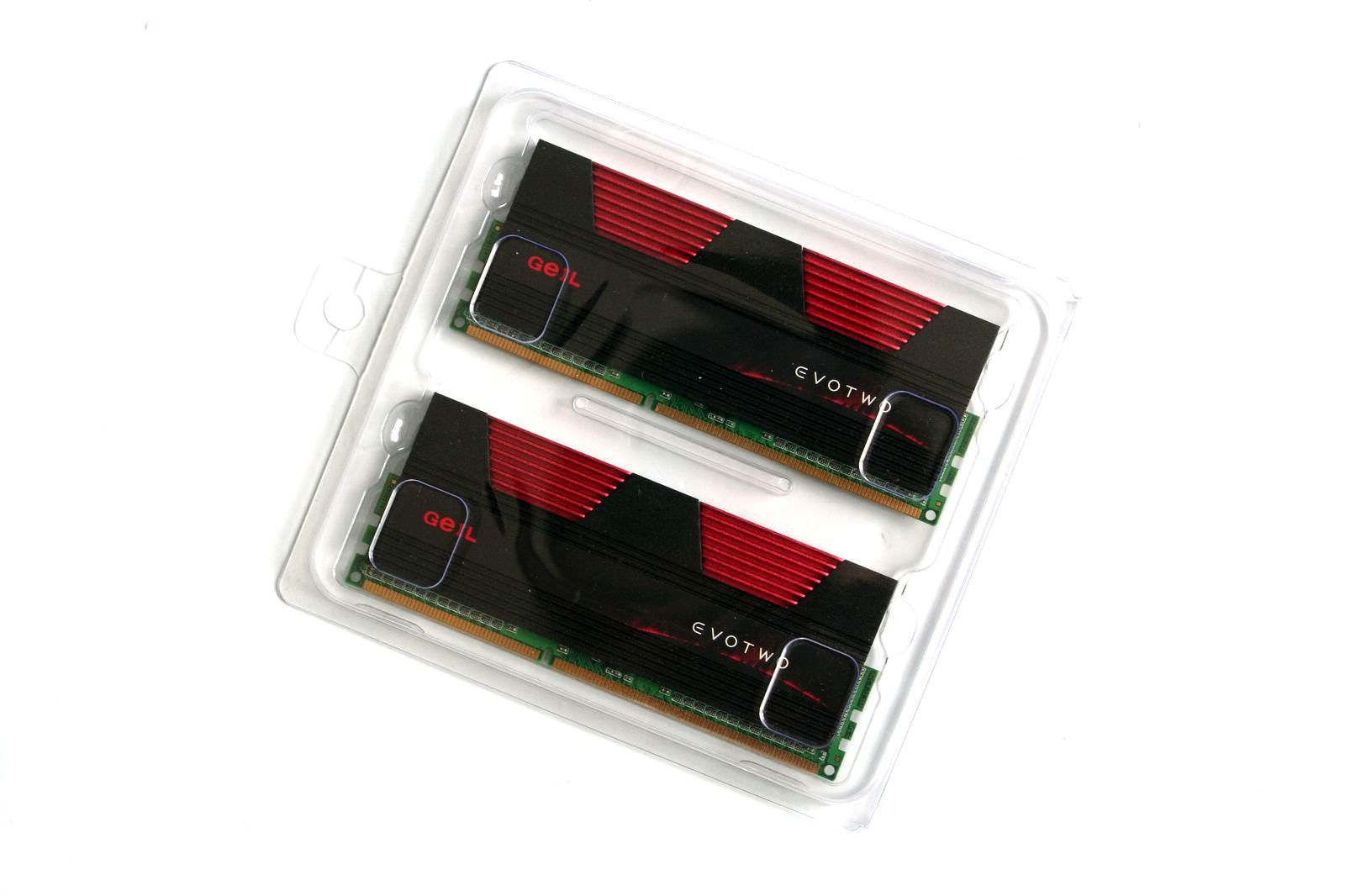 GeIL Evo Two este un produs pe care producătorul îl încadrează în categoria Gaming Series şi este disponibil în variante Dual Channel, Triple Channel, Quad Channel şi Hexa Channel. Pentru Dual Channel, sunt disponibile frecvenţe cuprinse între 1066 şi 2500MHz, cu latenţe de la CAS 7 la CAS 9. Modelul testat, GET34GB2133C9ADC, are o capacitate de 2x2GB şi funcţionează la 2133MHz, folosind latenţele 9-11-9-28 cu tensiunea de alimentare 1.65V.
