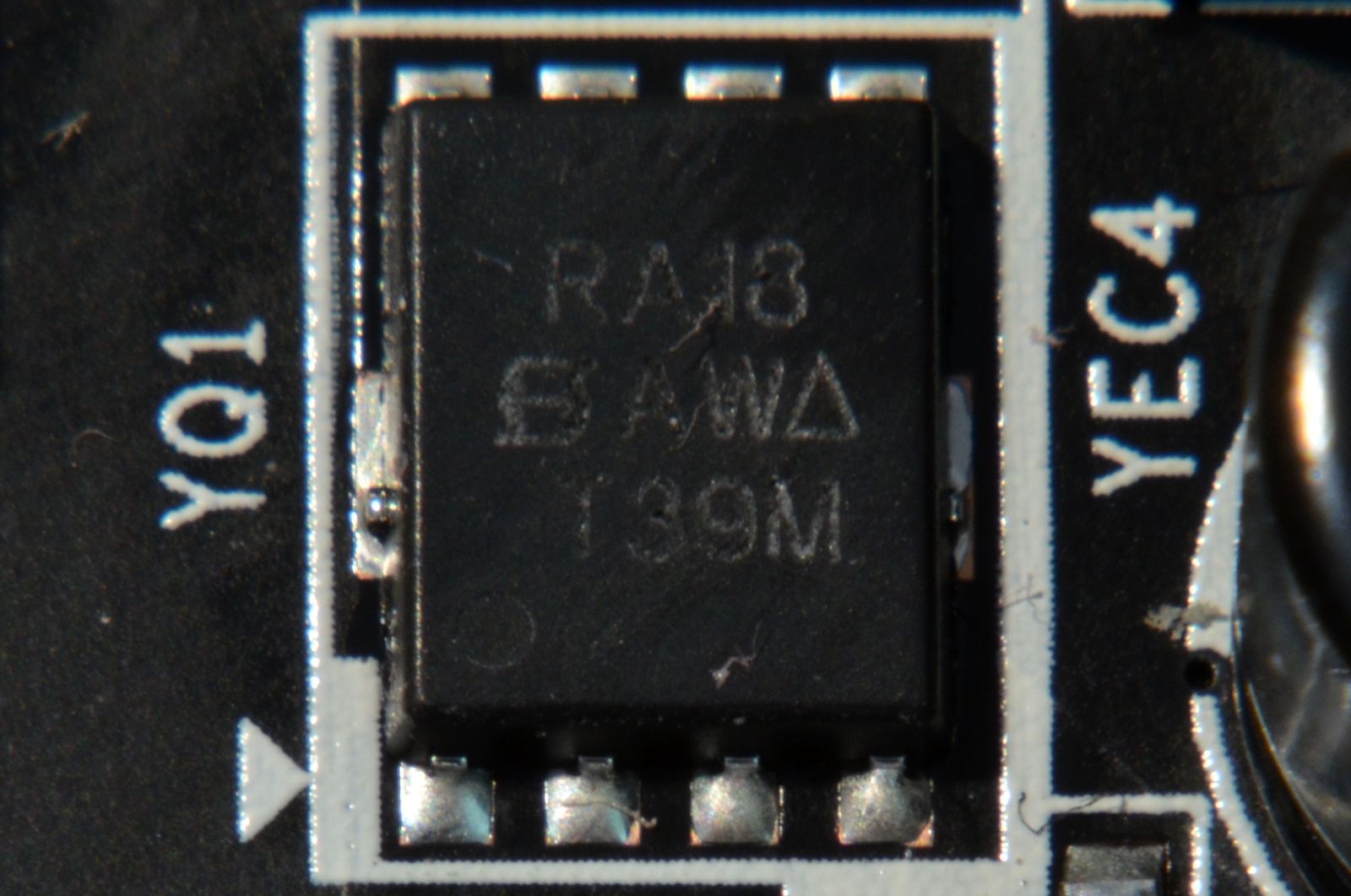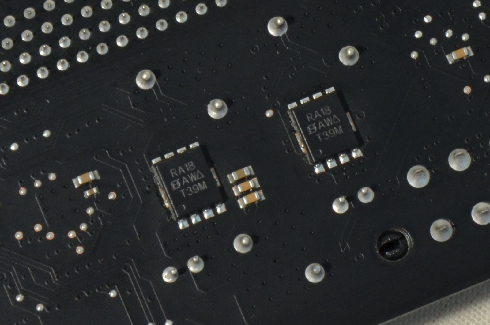 Pentru alimentarea memoriei RAM, a fost folosită o construcţie similară, doar că de această dată avem numai 2 faze şi fiecare fază dispune de câte 3 tranzistori, amplasaţi de ambele părţi ale PCB-ului. Şi de această dată avem de a face cu bobine cu miez de ferită şi condensatori certificaţi pentru 10 000 ore de funcţionare.