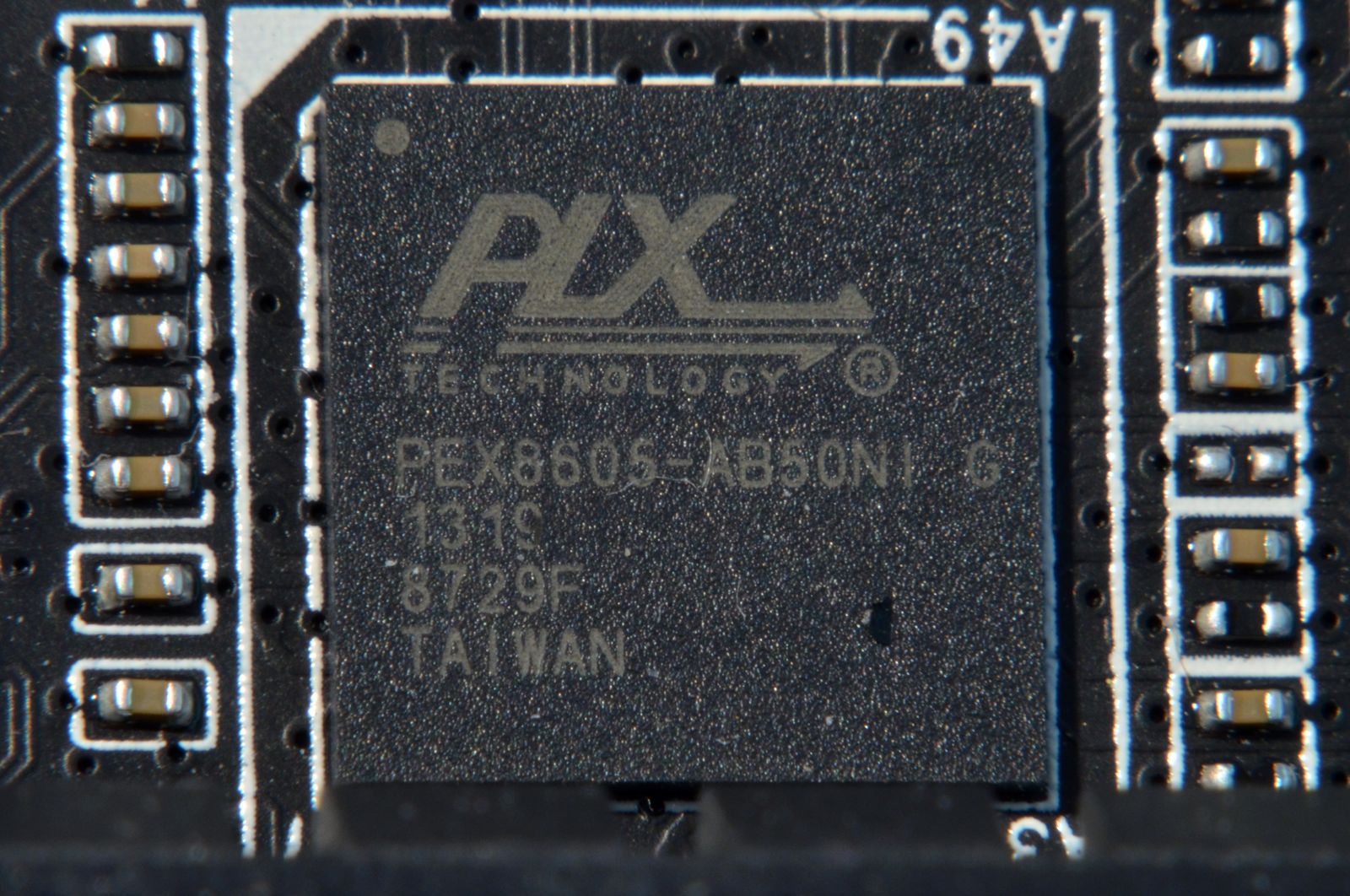 Coborând puţin mai jos pe lungimea PCB-ului, observăm un switch PCI-Express PEX8748 produs de PLX Technology, ce poate gestiona până la 48 canale PCI-Express Gen 3.0. El este completat de un mai banal switch PCI-Express Gen 2.0 PEX8605, amplasat între slot-urile de expansiune ale plăcii.