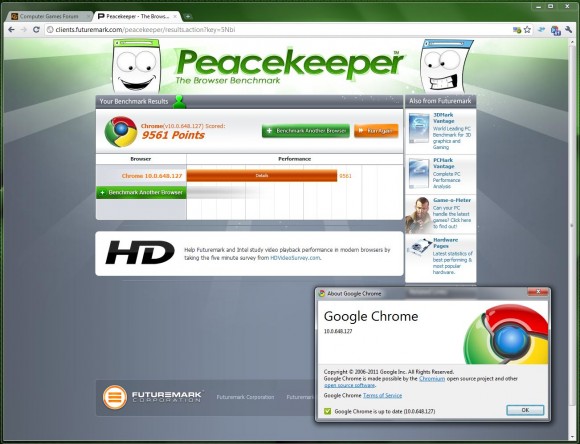 Utilizatorii versiunii stabile a browserului Google Chrome au primit astăzi actualizarea la versiunea 10. Un pas aşteptat datorită schimbărilor interesante observate în cadrul versiunii beta lansate acum 3 săptămâni, versiunea 10.0.648.127 oferă noua versiune a motorului JavaScript V8, Crankshaft, care aduce îmbunătăţiri masive ale vitezei de rulare a codului JS. De asemenea, se remarcă şi îmbunătăţiri ale performanţei accelerării hardware 3D, deşi facilităţile sunt încă oprite în mod implicit din panoul de control about:flags.
