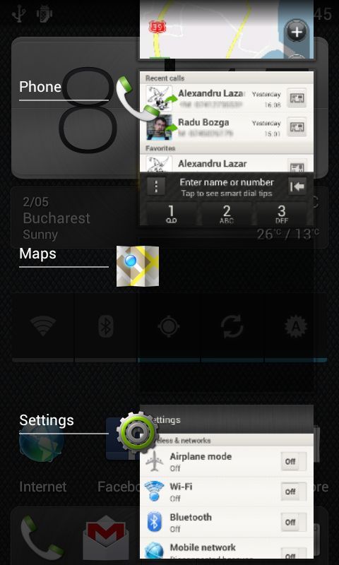 Android ar trebui să fie deja ceva cunoscut pentru oricine deci nu mai insist cu trecerea în revistă a tuturor aplicatiilor ci doar a celor particularizate de HTC. Excelentul People a rămas la fel de puternic, acesta oferind agregarea contactelor din mai multe surse (Gmail, Twitter, Facebook), separarea lor pe grupuri (fără tonuri de apel la nivel de grup, din păcate), agregarea apelurilor, mesajelor text, email-urilor sau imaginilor pentru fiecare contact în parte și widget-urile multiple pentru apelare rapidă. Partenerul său, Phone, oferă acces rapid la lista de apeluri pierdute sau favorite, de data acesta într-un Action Bar în loc de taburi, Smart Dial și Voice Dial via Google Voice Search.
