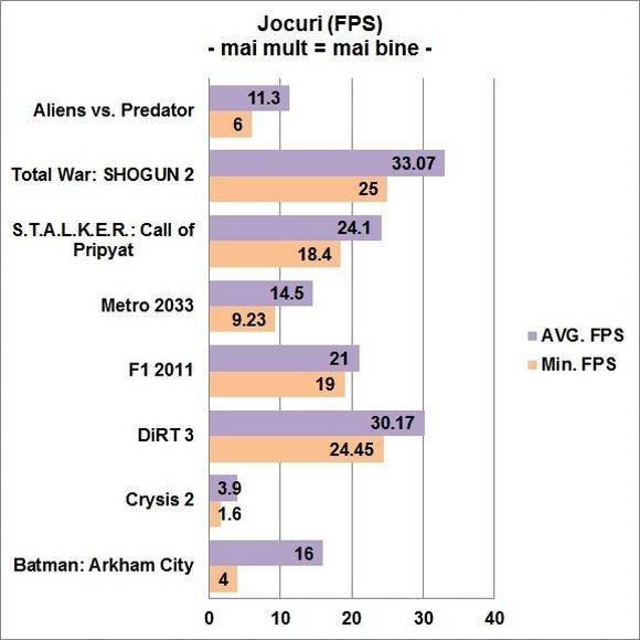 La final, am rulat şi câteva jocuri, dar numai la setările de overclocking. Toate titlurile de mai jos au fost rulate la setările minime de calitate, folosind o rezoluţie de 1920×1080 pixeli. Aşa cum veţi vedea, APU-ul nu a reuşit să satisfacă nici măcar în aceste condiţii.