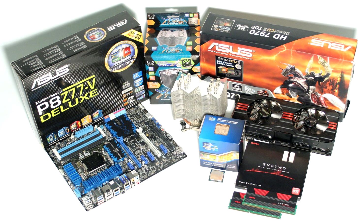 Aşadar, mulţumită AMD România şi ASUS România, avem o platformă nou-nouţă, construită cu componente din generaţia actuală. Avem acum o placă de bază ASUS P8Z77-V Deluxe şi o placă video ASUS HD7970-DC2T-3GD5, de care suntem foarte mândri. De asemenea, am procurat şi un procesor Intel Core i7 3770K şi un kit de memorii RAM GeIL Evo Two 2x4GB 2400MHz 10-11-11-30 1T.