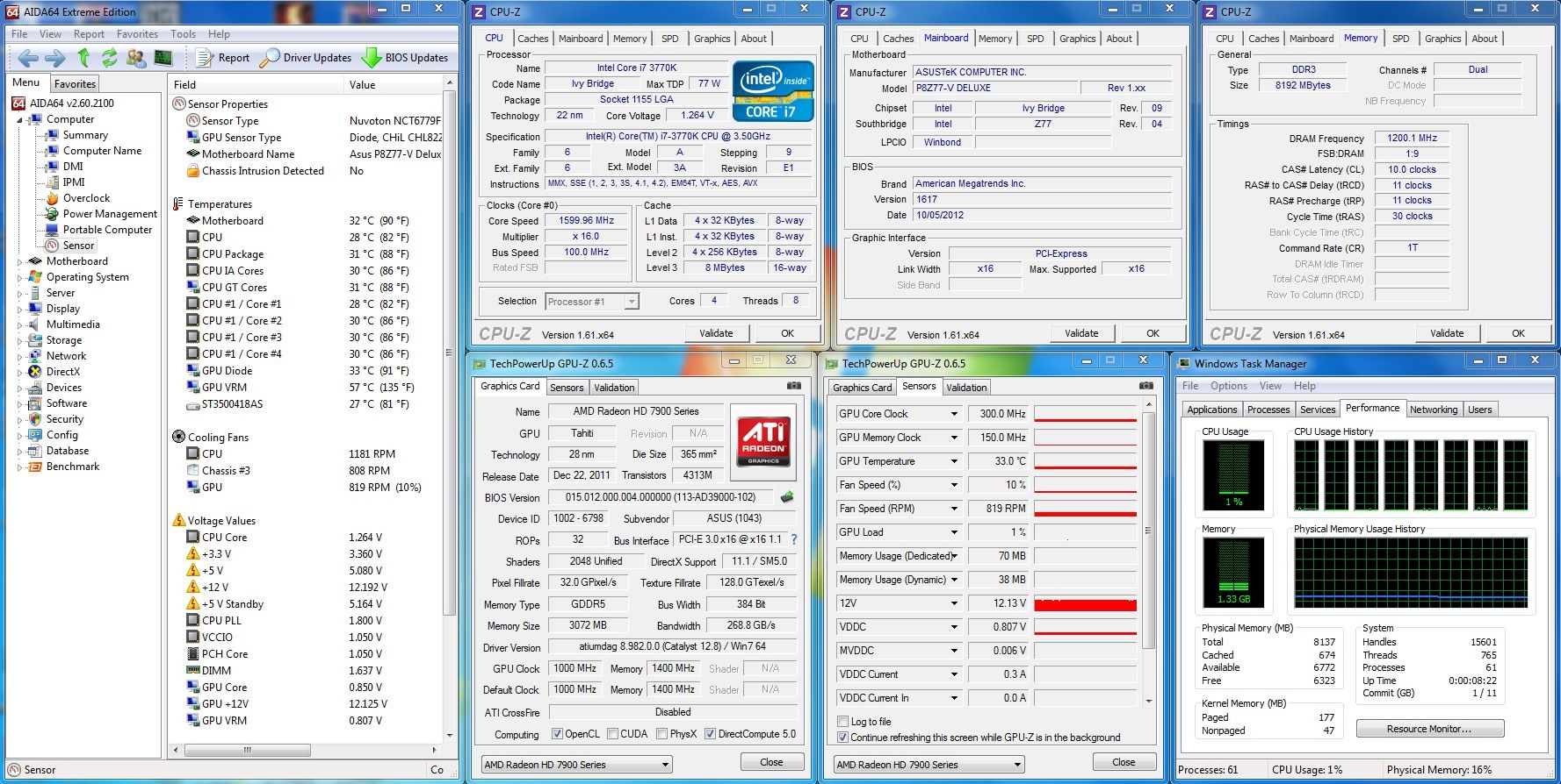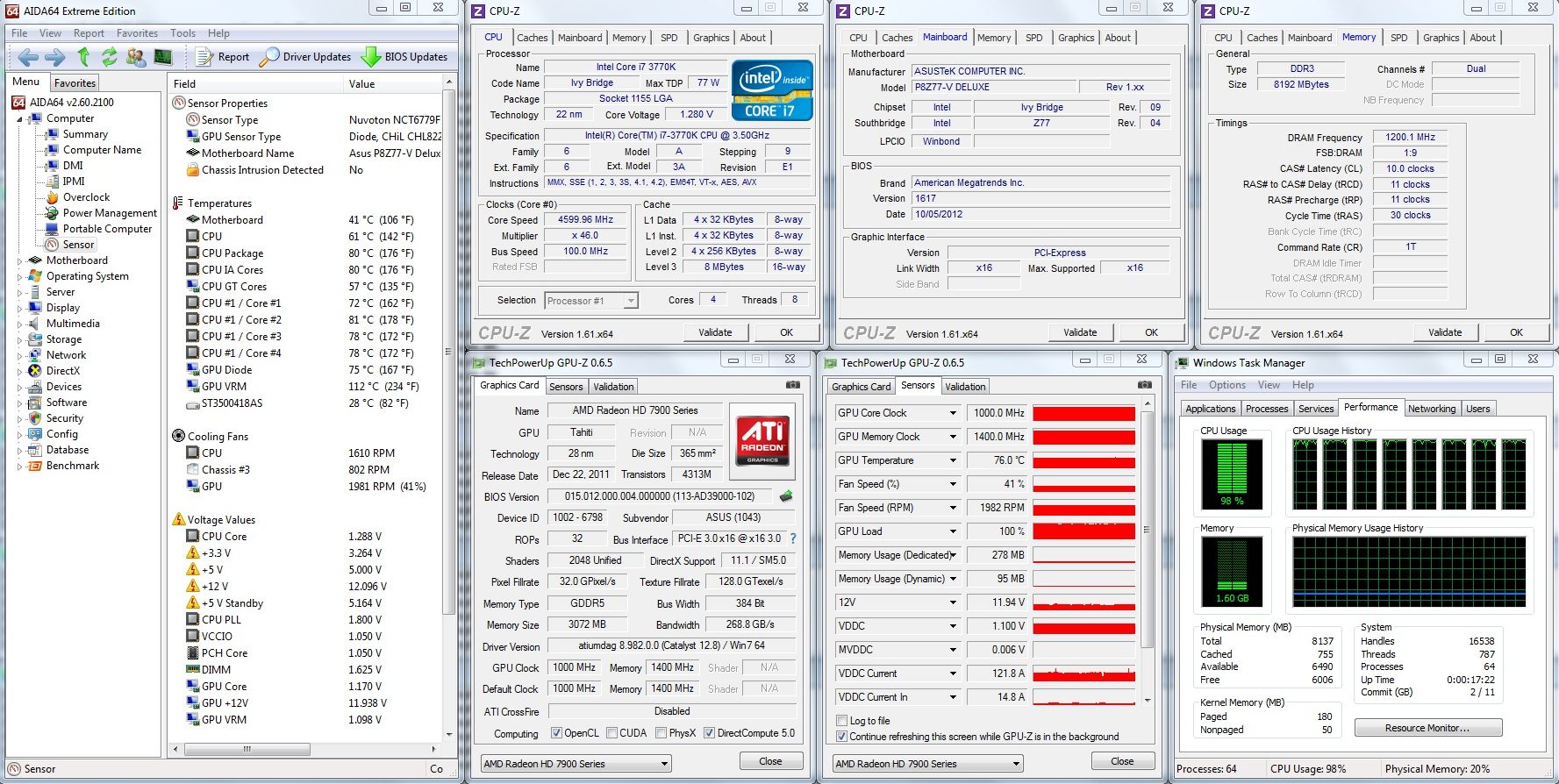 Mai trebuie spus că de această dată am adoptat o poziţie elegantă în construirea platformei de test, motiv pentru care am menţinut active tehnologiile menite să scadă consumul de energie. De asemenea, regimul de funcţionare ales pentru ventilatul cooler-ului de procesor a fost cel dinamic, selectând profilul Silent din BIOS-ul plăcii de bază. Ce am obţinut, puteţi vedea mai jos, atât în Idle cât şi în sarcină. Pentru solicitarea intensivă a configuraţiei, am rulat simultan FurMark şi Prime95.