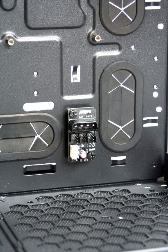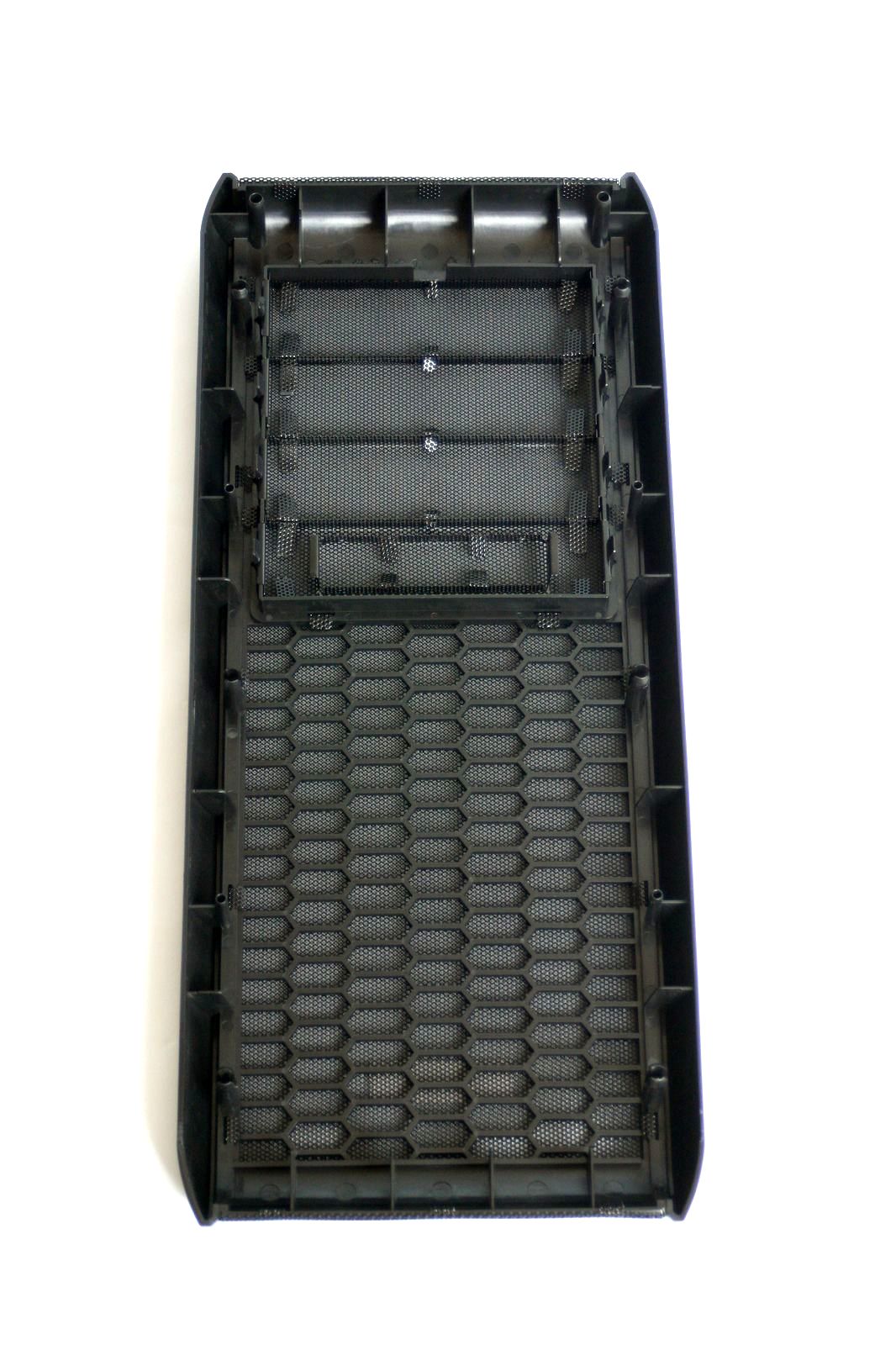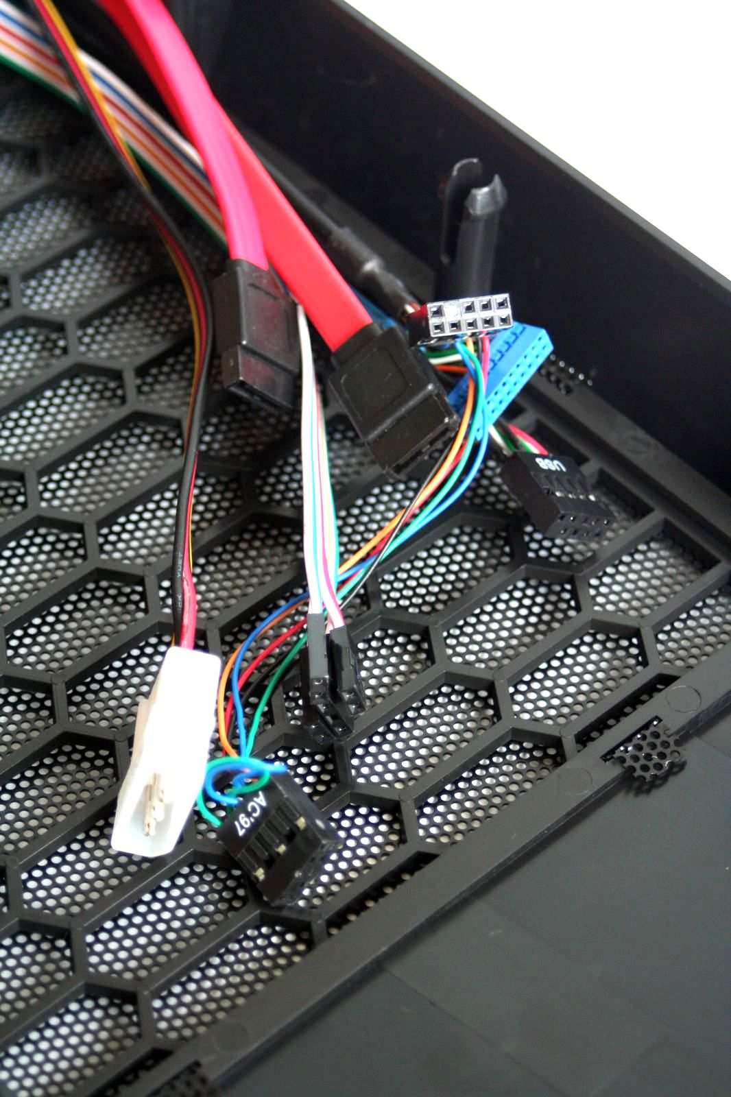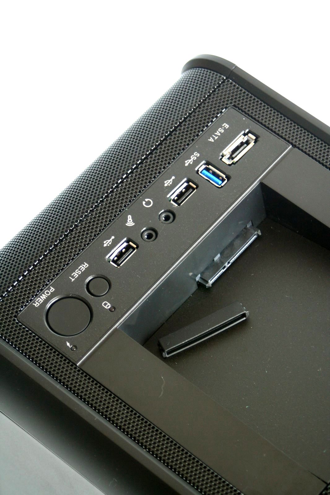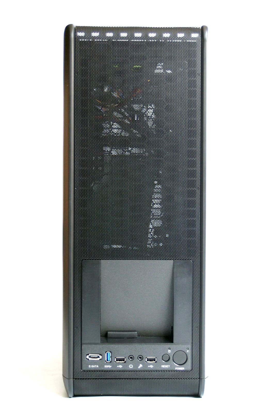 Partea superioară a carcasei conţine şi panoul frontal, alcătuit din butoanele Power şi Reset, LED-urile, două porturi USB 2.0 şi unul USB 3.0, un conector eSATA, conectorii audio pentru căşti şi microfon, dar şi conectori SATA pentru conectarea unui harddisk. Înlăturarea măştii superioare, care este şi ea perforată, dezvăluie încă un filtru împotriva prafului, în spatele căruia pot fi montate două ventilatoare de 140mm sau de 120mm.