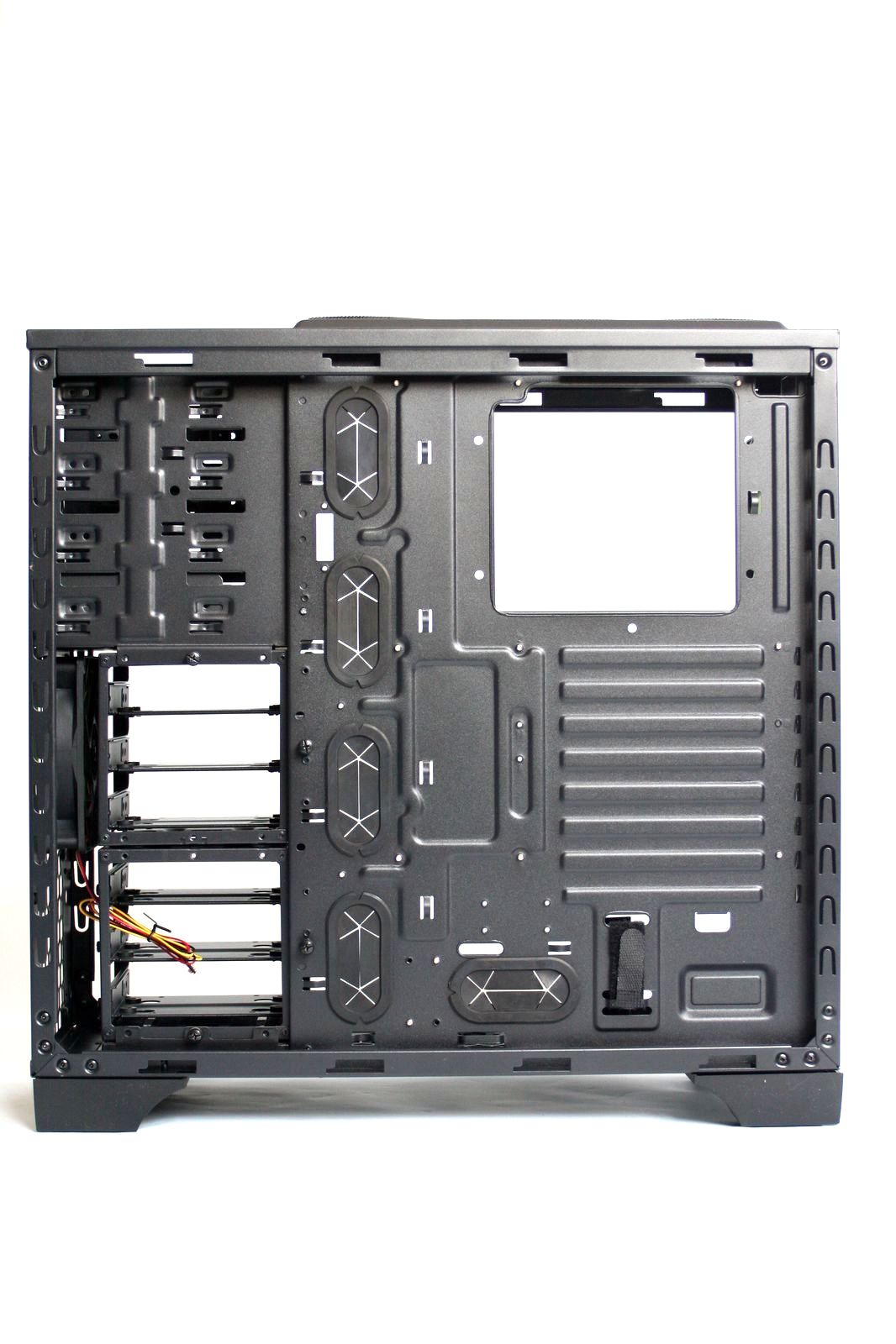 Să mergem însa mai departe şi să aruncăm o privire şi în interior. În primul rând, se observă un tray pentru placa de bază decupat în suficiente locuri pentru a permite un cable management cât mai bun. De asemenea, decuparea sa în dreptul socket-ului pentru procesor facilitează o schimbare mai uşoară a ventilatorului. În spatele tray-ului, se observă un spaţiu generos pentru ascunderea cablurilor.