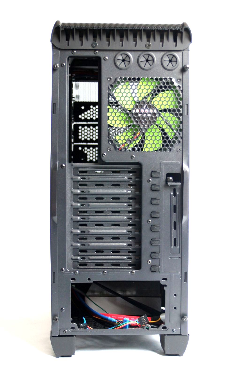 În partea din spate, sunt prezente trei orificii pentru sisteme de răcire cu apă, un ventilator de 120mm de aceeaşi culoare ţipătoare ca cel din faţă şi opt slot-uri de expansiune.