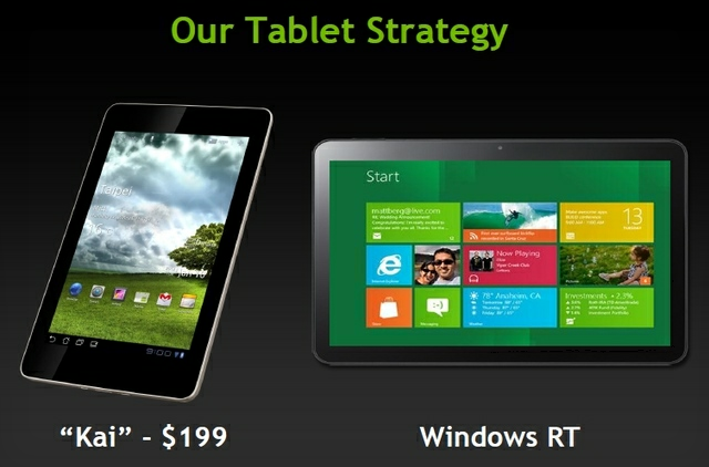 În final, compania a anunțat astăzi că lucrează la o platformă hardware numită Kai, neprecizând însă dacă este un design de referință sau o versiune nouă cu cost mai scăzut a chipului Tegra 3, și că aceasta va permite lansarea unor tablete quad-core cu un preț de 199$.