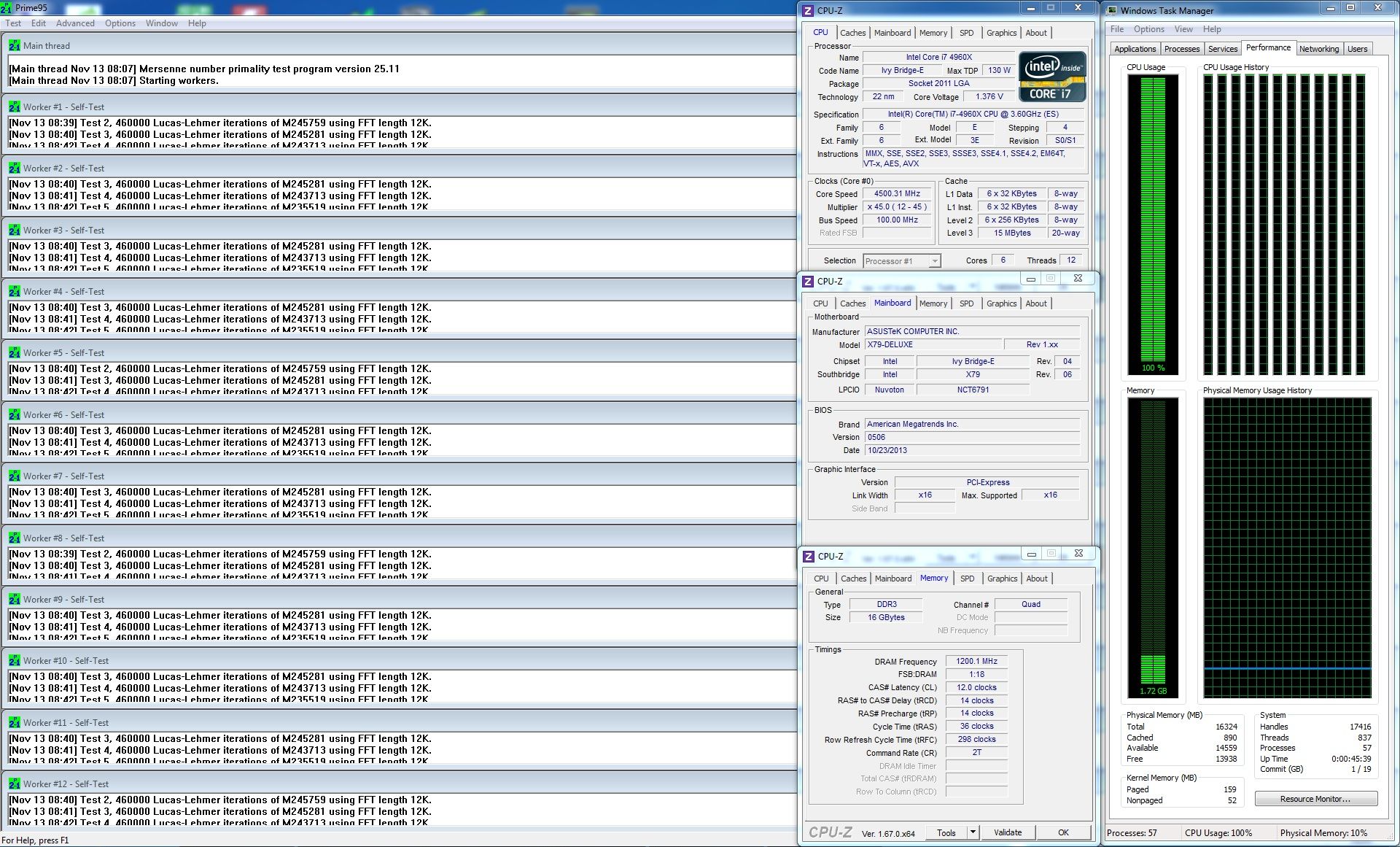 Când vorbim despre componente destinate entuziaştilor, potenţialul de overclocking are un rol aparte şi nu poate fi neglijat. Totuşi, frecvenţele uluitoare atinse de diverse componente preţ de câteva minute, cât să ruleze vreun benchmark, mă cam lasă rece. Personal, mă interesează mai mult frecvenţa maximă la care poate fi folosită o componentă în condiţii de stabilitate. Şi acelaşi principiu l-am aplicat şi în cazul lui Intel Core i7-4960X. Din păcate, nu am reuşit să depăşesc pragul de 4.5GHz, obţinut prin aplicarea unui multiplicator de 45x bus-ului de 100HMz şi prin utilizarea unei tensiuni de alimentare de 1.35V (majorate de un LLC agresiv la 1.376V în sarcină).