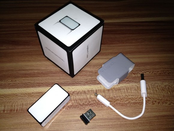 Cutia albă și cubică cu latura de 70mm ascunde un conținut bun: în afară de perifericul efectiv, aceasta mai conține infimul receptor wireless Unified cu conectare USB, Cube putând fi astfel cuplat cu orice receptor deja prezent al unui alt periferic Logitech compatibil, o husă albă pentru protecție, care din păcate nu are și locaș pentru receptor, un cablu de încărcare USB-Micro USB meschin de scurt și o foaie împăturită cu niște instrucțiuni spartane.