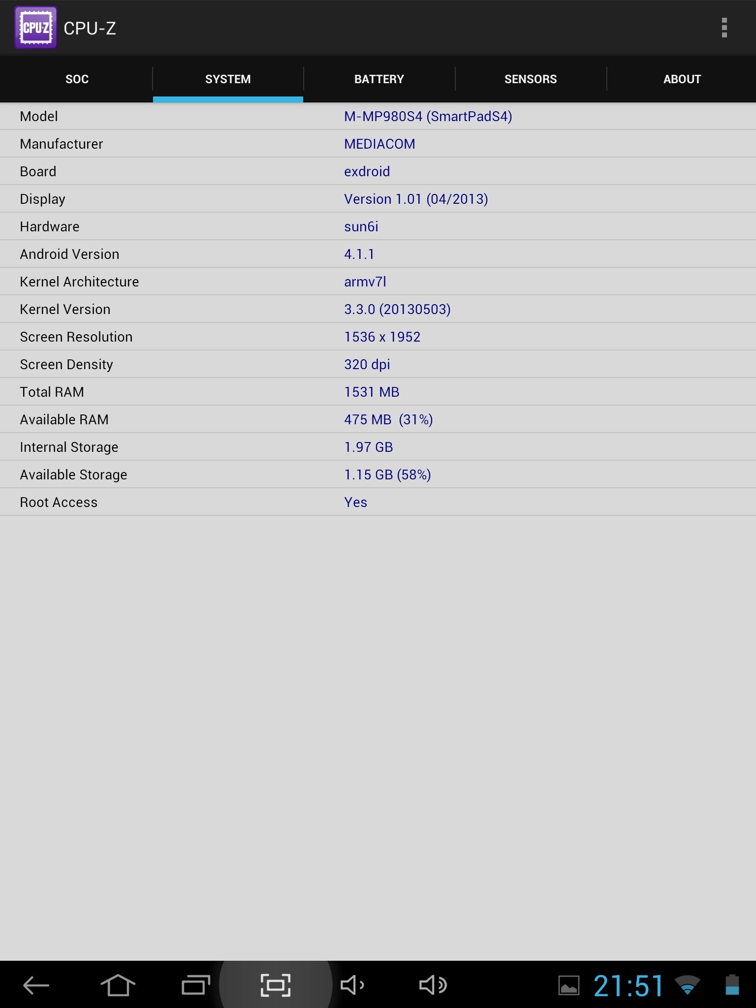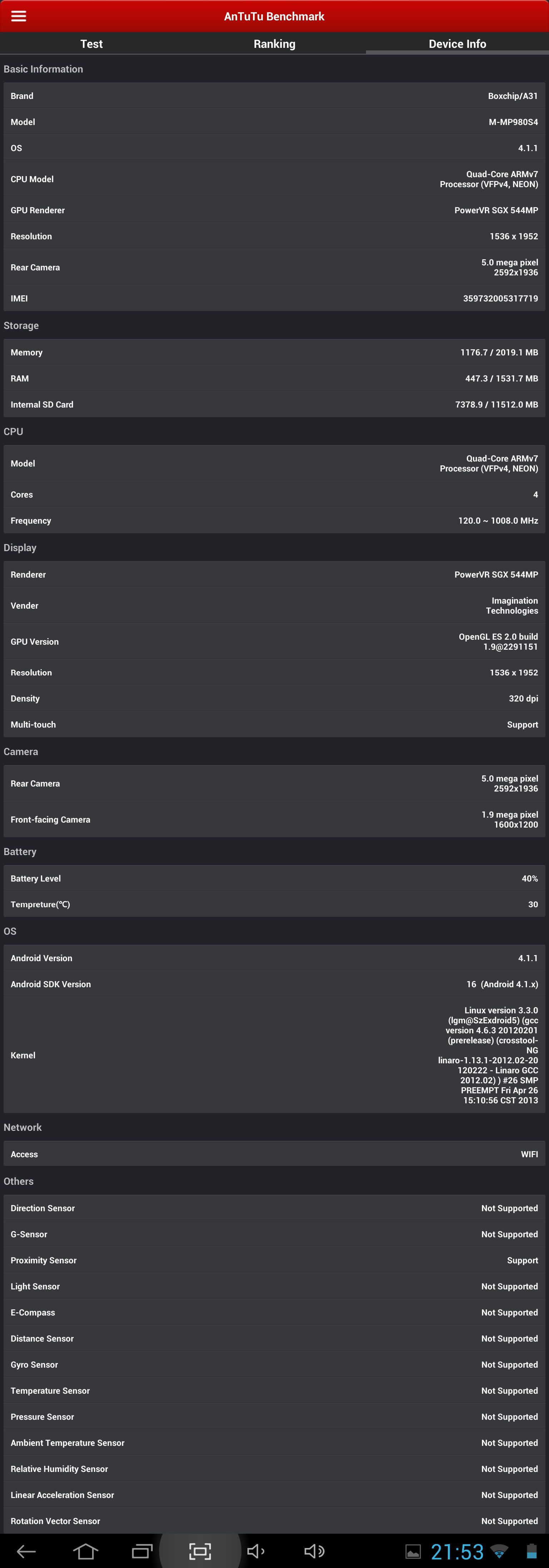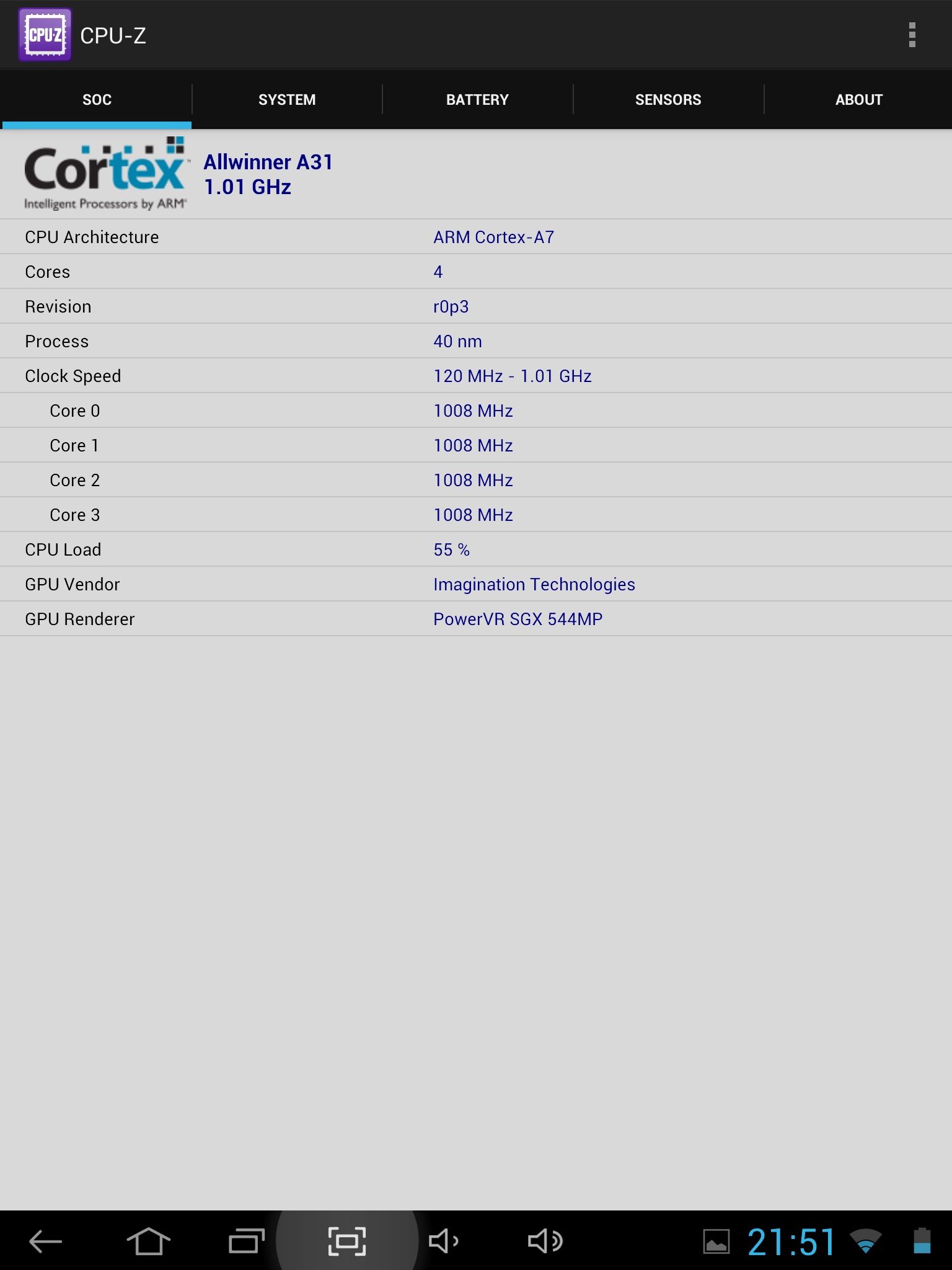 Producătorul specifică o configuraţie bazată pe un procesor cu 4 nuclee Cortex-A7 tactate la 1.2GHz, soluţie grafică PowerVR SGX , memorie RAM cu capacitatea de 2GB şi capacitate de stocare internă de 16GB. Cu toate acestea, CPU-Z raportează o frecvenţă de numai 1GHz pentru procesor, iar memoria RAM pare a avea capacitatea de 1.5GB.