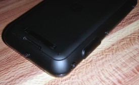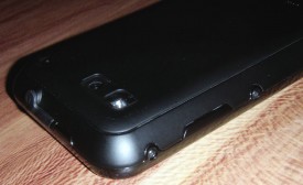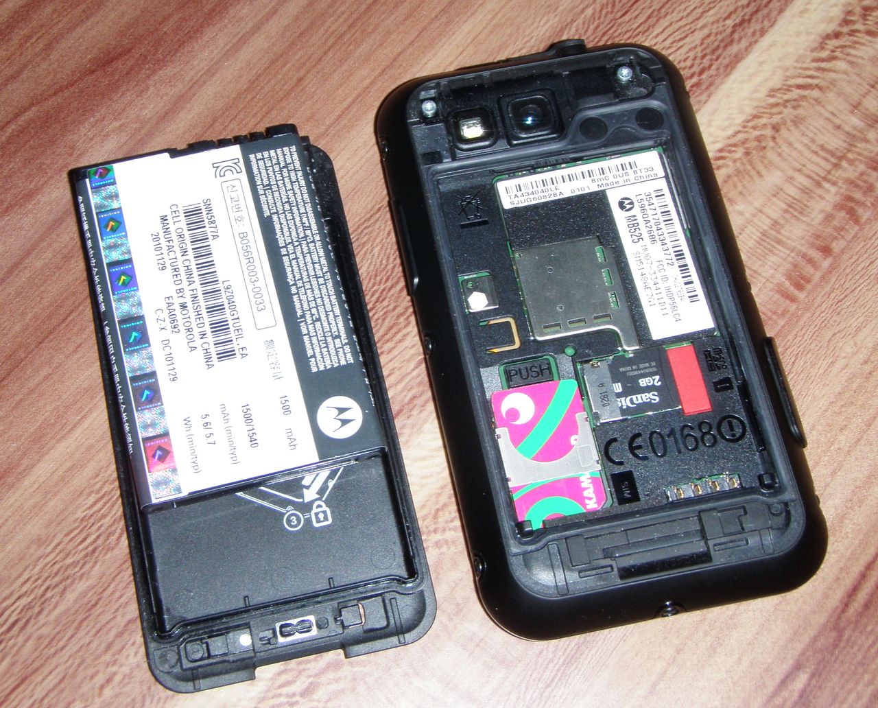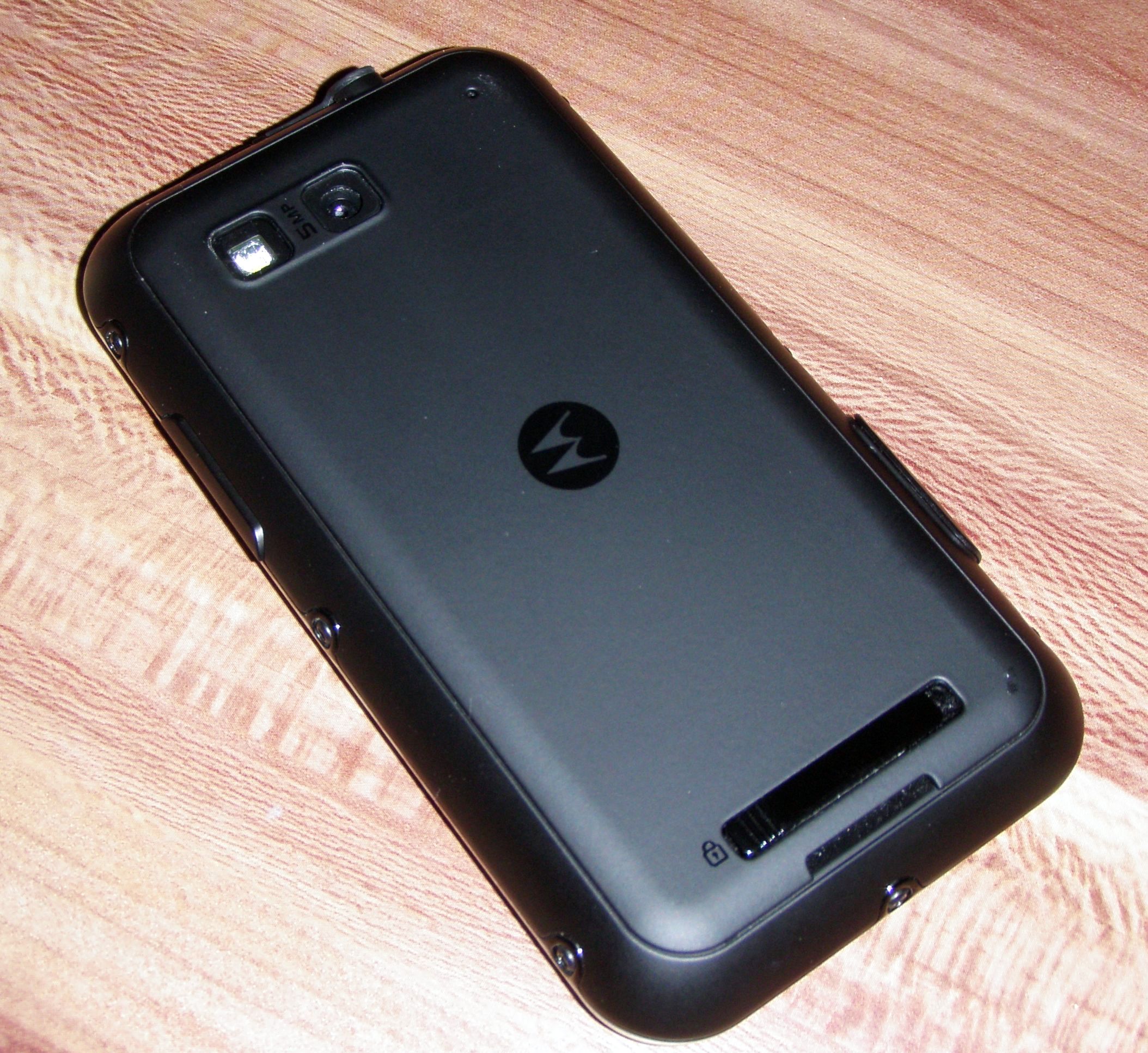 Partea din spate a terminalului a fost uşor dezamăgitoare. Construit dintr-un material plastic cu textură cauciucată antiderapantă, capacul posterior pare cam fragil şi sună neplăcut a gol. Doar după ce m-am uitat în gol la el timp de 3 minute, admirând obiectivul camerei, LED-ul blițului alăturat şi sistemul culisant de închidere, mi-am dat seama ce lipseşte şi care este motivul acestei alegeri. Din cauza aceleiași etanșeități, Defy nu are un difuzor extern ci unul intern, toata partea sa din spate funcţionând ca o camera de rezonanţă. Evident, calitatea sunetului va fi afectată, dar altă soluţie nu ar fi putut fi implementată. Capacul posterior este uşor curbat spre exterior, presiunea necesară închiderii ermetizând locaşul bateriei, SIM-ului şi cardului MicroSD.
