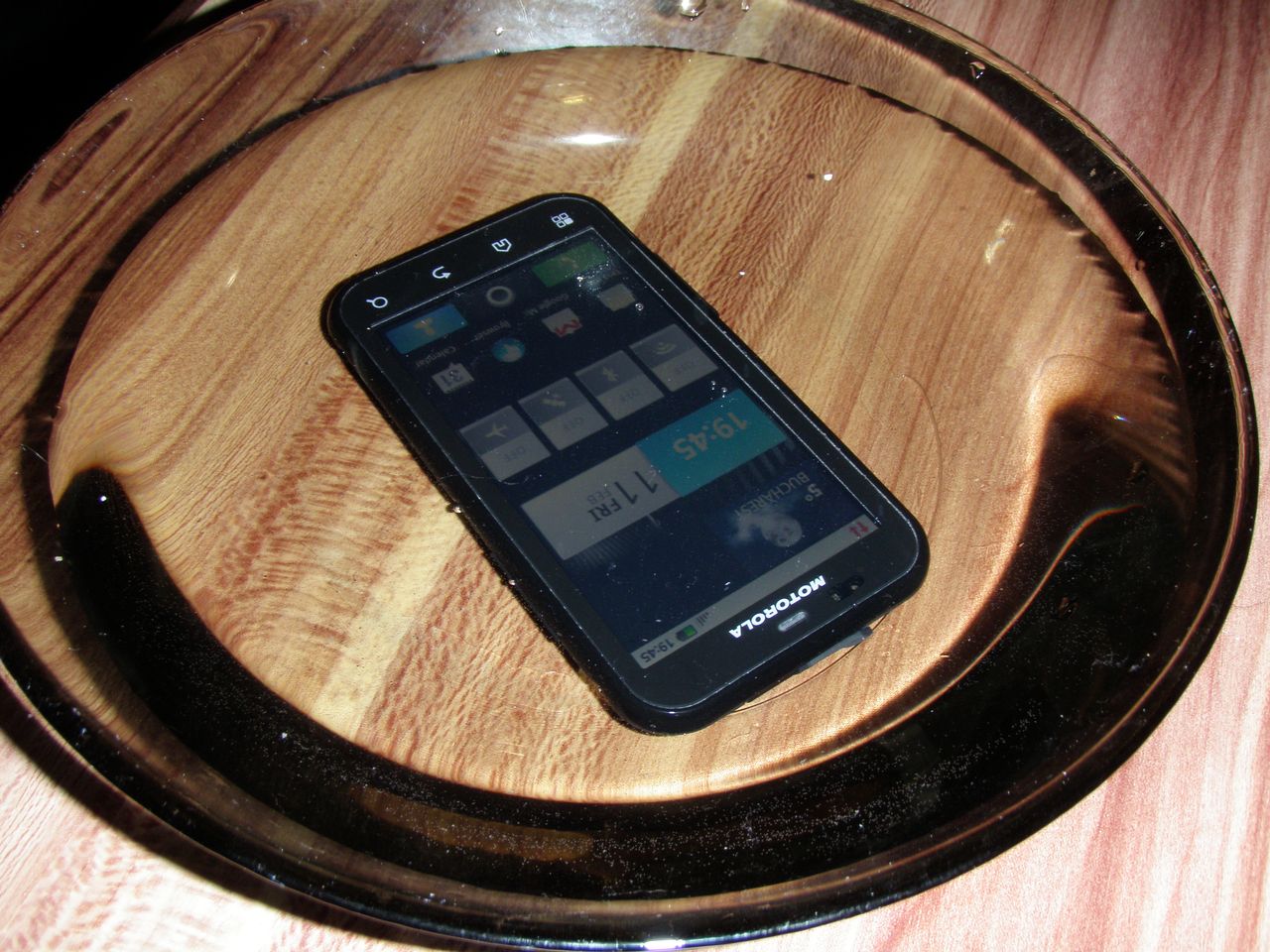 Prima dată am purces la testul subacvatic. Sper să se vadă clar din fotografii, dar terminalul Motorola a petrecut 15 minute din viaţă pe fundul unei farfurii pline cu apă într-o imersiune completă. După ce sfertul neacademic i-a expirat, a fost extras şi a funcționat la fel de bine ca înainte de acest incident artizanal.
