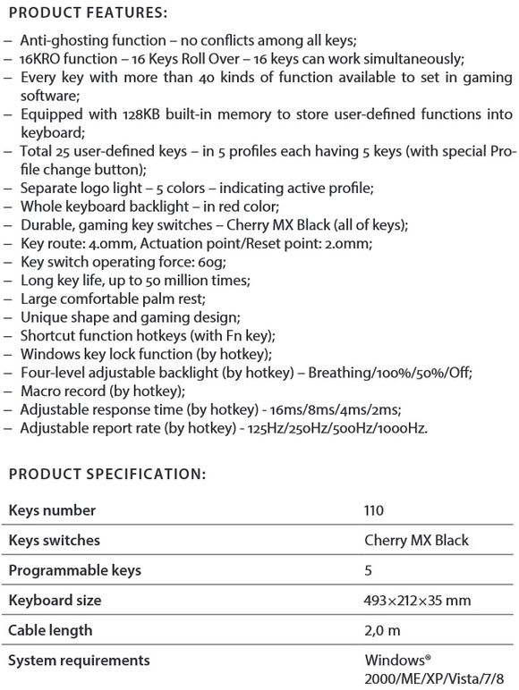 Vorbim deci despre o tastatură mecanică cu backlight ajustabil, funcţie Anti-ghosting, posibilitatea de a acţiona simultan până la 16 taste, 128KB memorie internă, profile de utilizare şi taste configurabile şi rată de raportare ajustabilă, până la 1000Hz.