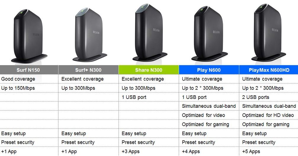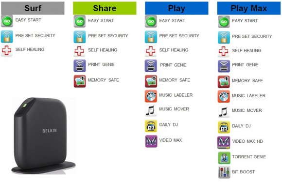 Un al treilea pilon al noii strategii Belkin este pachetul de aplicații incluse în fiecare router. Gama Surf este destinată persoanelor care doresc doar să navigheze online de oriunde din locuinţa lor şi care au fost împiedicaţi până acum să facă acest lucru de instalarea mult prea complicată a routerelor tradiţionale. Aplicaţiile modelului Share uşurează partajarea, imprimarea şi salvarea de siguranţă a tuturor fotografiilor şi fişierelor audio sau imprimarea şi scanarea în mod wireless – aplicaţia Print Genie va permite conectarea la orice imprimantă USB multifuncţională. Suplimentar faţă de caracteristicile modelelor Surf şi Share, routerele Play şi Play Max oferă maximum de tehnologie, oferind conectivitate 802.11n dual-band şi cea mai extinsă gamă de facilităţi, incluzând streamingul media către echipamente UPnP AV, client BitTorrent, management de bandă sau chiar suport pentru generarea de liste de redare audio automate în funcţie de preferinţe. Toate aceste aplicatii interne au grafii uşor de recunoscut şi denumiri uşor de înţeles, simplificând alegerea utilizatorului final.