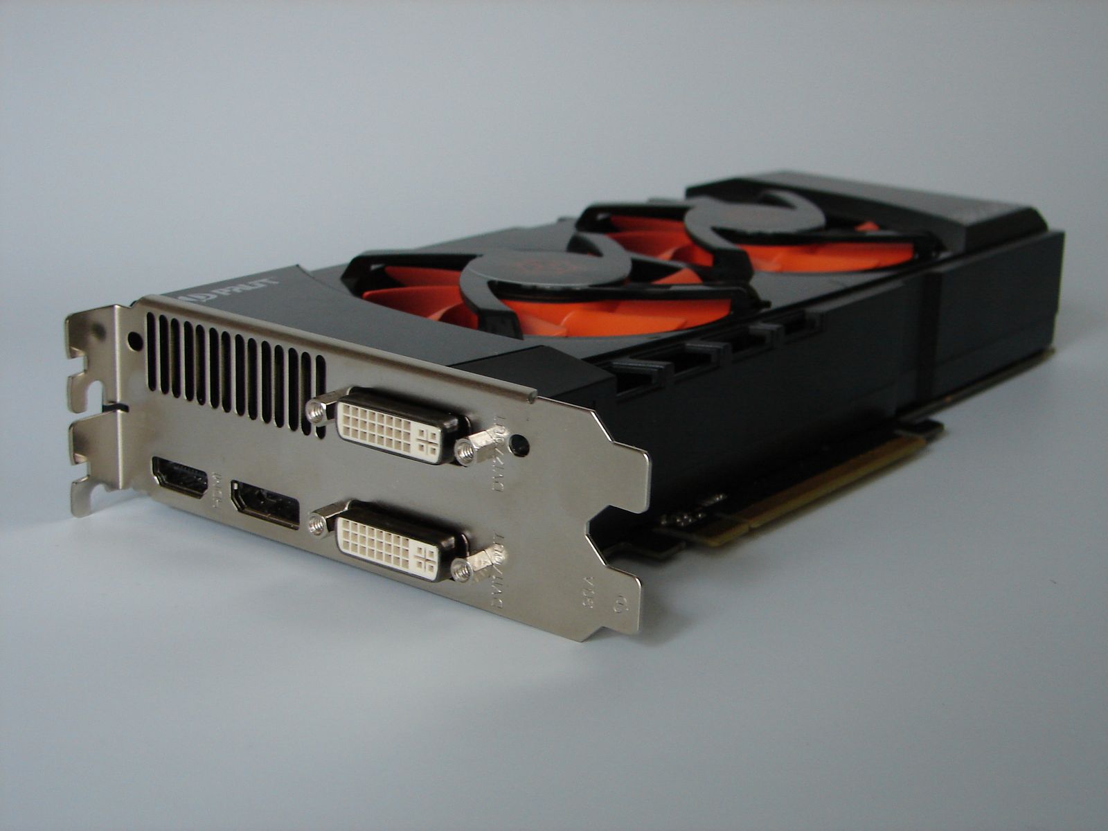 O veste bună pentru utilizatori este că Palit a copiat pentru GTX 465 bracket-ul dual slot utilizat de soluţiile grafice AMD din seria Radeon HD 5800. Astfel, acesta conţine doi conectori DVI, un port HDMI şi un DisplayPort. Restul spaţiului disponibil a fost utilizat pentru realizarea unei fante de evacuare a căldurii. De apreciat în cazul celor cu carcase mai înghesuite este şi amplasarea celor doi conectori de alimentare pe lateralul plăcii şi nu în capătul ei.