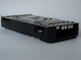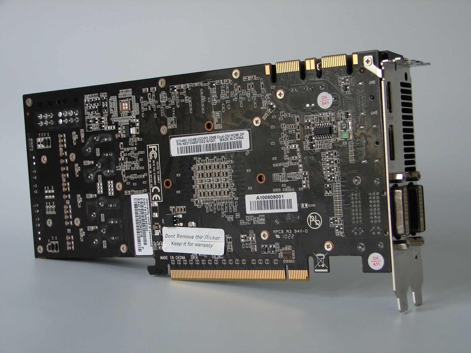 La nivel de PCB, faţă de prima implementare GTX 465 testată – cea cu PCB de GTX 470 – se observă diferenţe semnificative. În primul rând, sunt prezente numai opt chip-uri de memorie, iar găurile de ventilaţie nu mai există , ele nefiind necesare. VRM-ul este alcătuit din acelaşi număr de stagii – 4+1 – numai că pentru fiecare stagiu aferent nucleului grafic sunt folosiţi câte patru tranzistori în loc de trei.