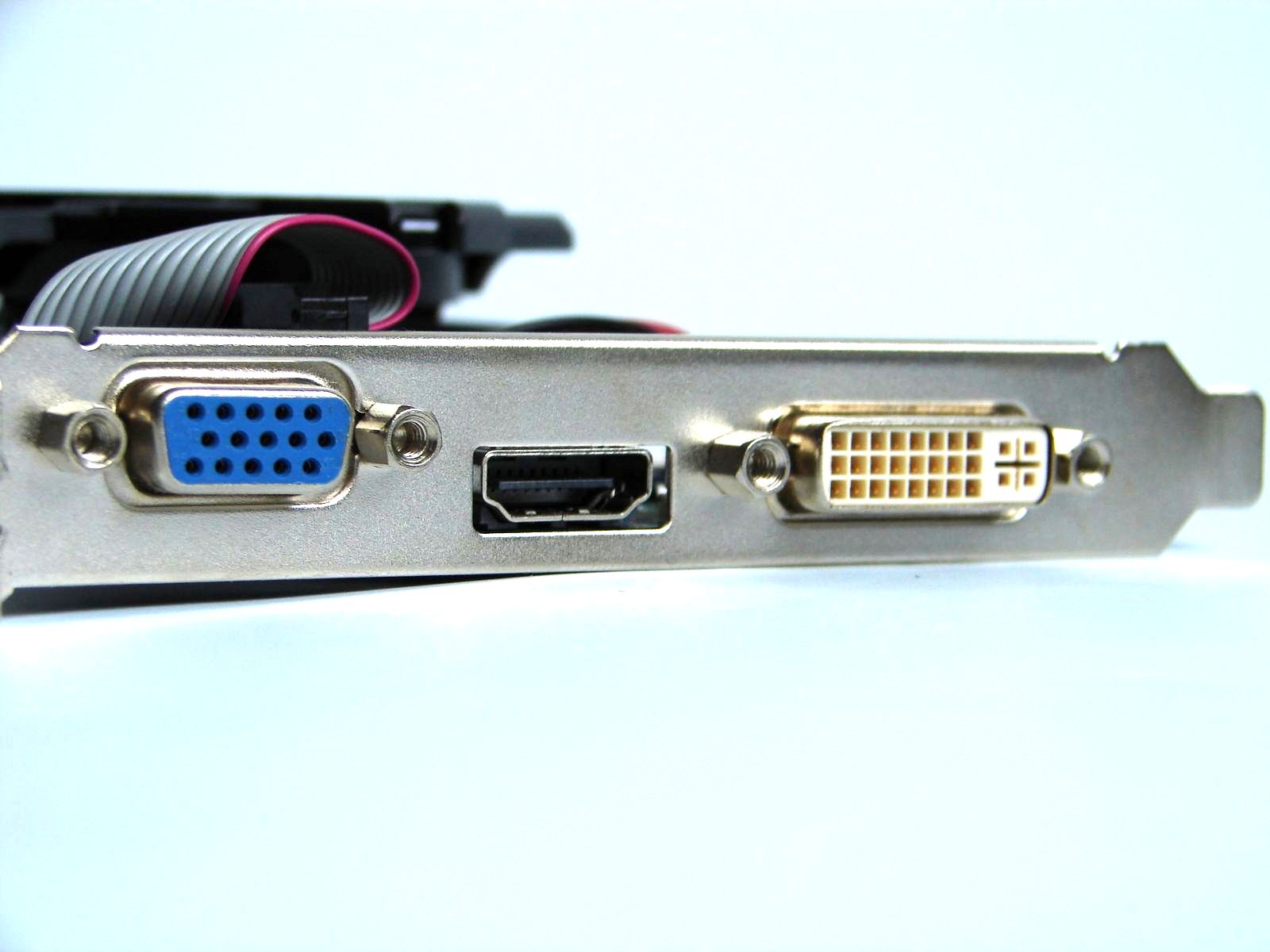 Bracket-ul single slot conţine trei conectori video: VGA, DVI şi HDMI. Conectorul VGA este oferit prin intermediul unei extensii, la care utilizatorul va fi nevoit să renunţe dacă doreşte să utilizeze placa împreună cu un bracket low profile, care nu este însă livrat în pachet.