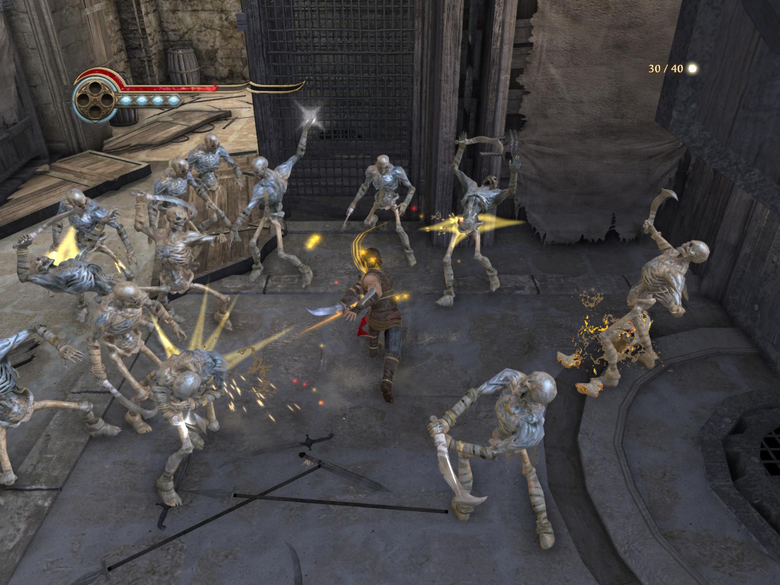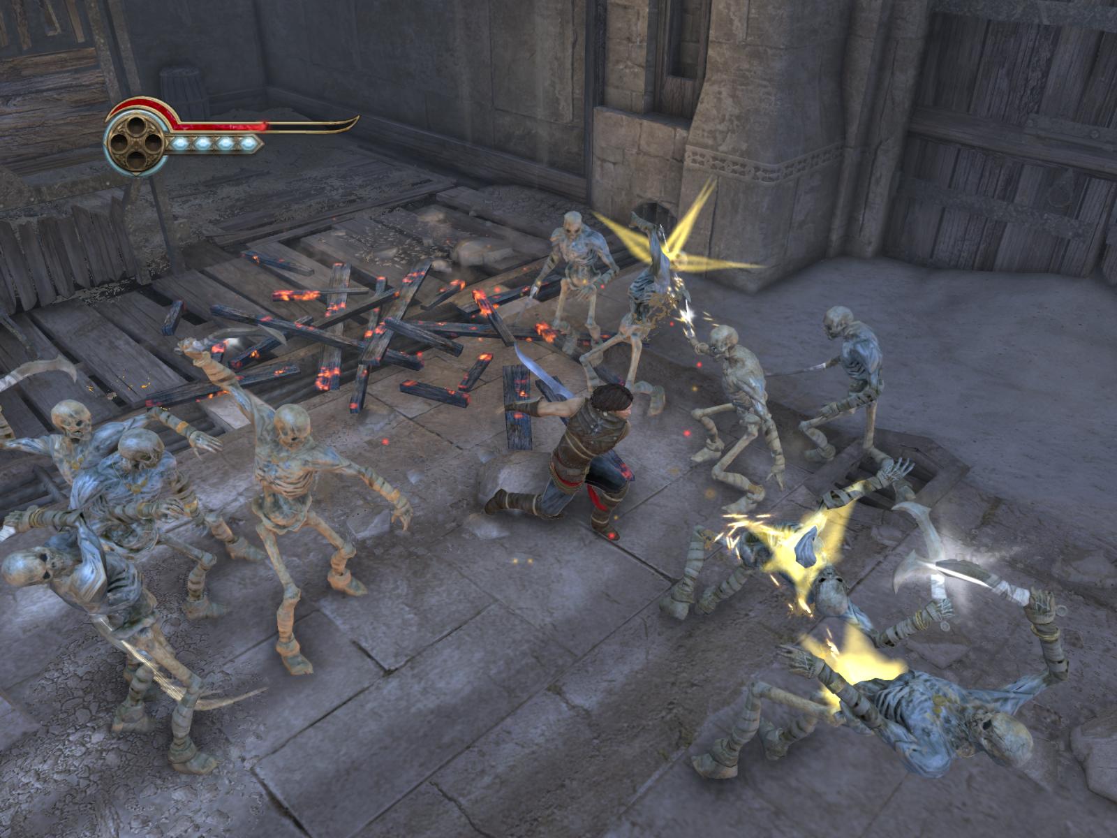 Alături de secvenţele acrobatice, prinţul va da piept şi cu armata nisipurilor, în cea mai mare parte alcătuită din schelete care ies din podele. Eroul are la dispoziţie un atac normal, un Power Attack pentru anumiţi boşi şi poate combina salturi şi rostogoliri cu cele două tipuri de atac pentru a lega până la cinci combo-uri.