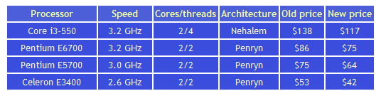 Având un preţ redus cu 21 dolari, Intel Core i3-550 poate fi achiziţionat acum pentru numai 117 dolari, cu doar patru dolari mai mult decât modelul inferior, Core i3-530. Versiunile pentru socket LGA-775, Intel Pentium E6700, E5700 şi Celeron E3400, beneficiază fiecare de preţuri reduse cu câte 11 dolari.
