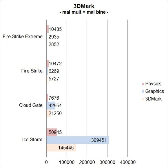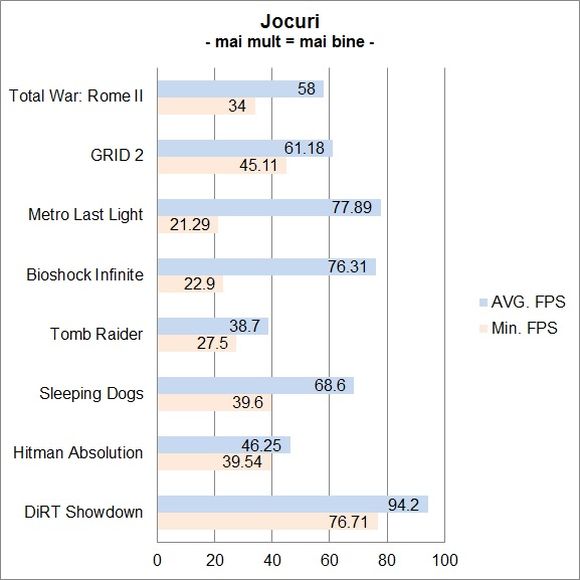 Când vorbim despre Serioux NVIDIA H7, vorbim despre un sistem de calcul ce a fost creat special pentru gameri. De aceea, am construit procedura de testare în jurul acestei idei. Drept urmare, m-am limitat la rularea popularului benchmark 3DMark şi la câteva jocuri cunoscute. Cu acest prilej, am testat şi aplicaţia GeForce Experience pentru a găsi setările optime în fiecare caz în parte. Exceptând Metro Last Light, utilitarul NVIDIA s-a descurcat surprinzător de bine. Ce a ieşit, puteţi vedea mai jos: