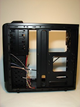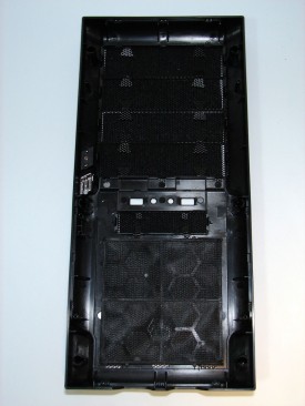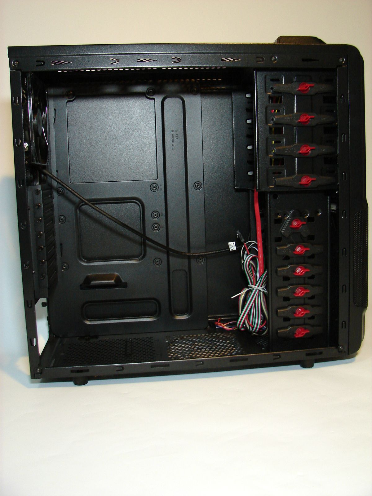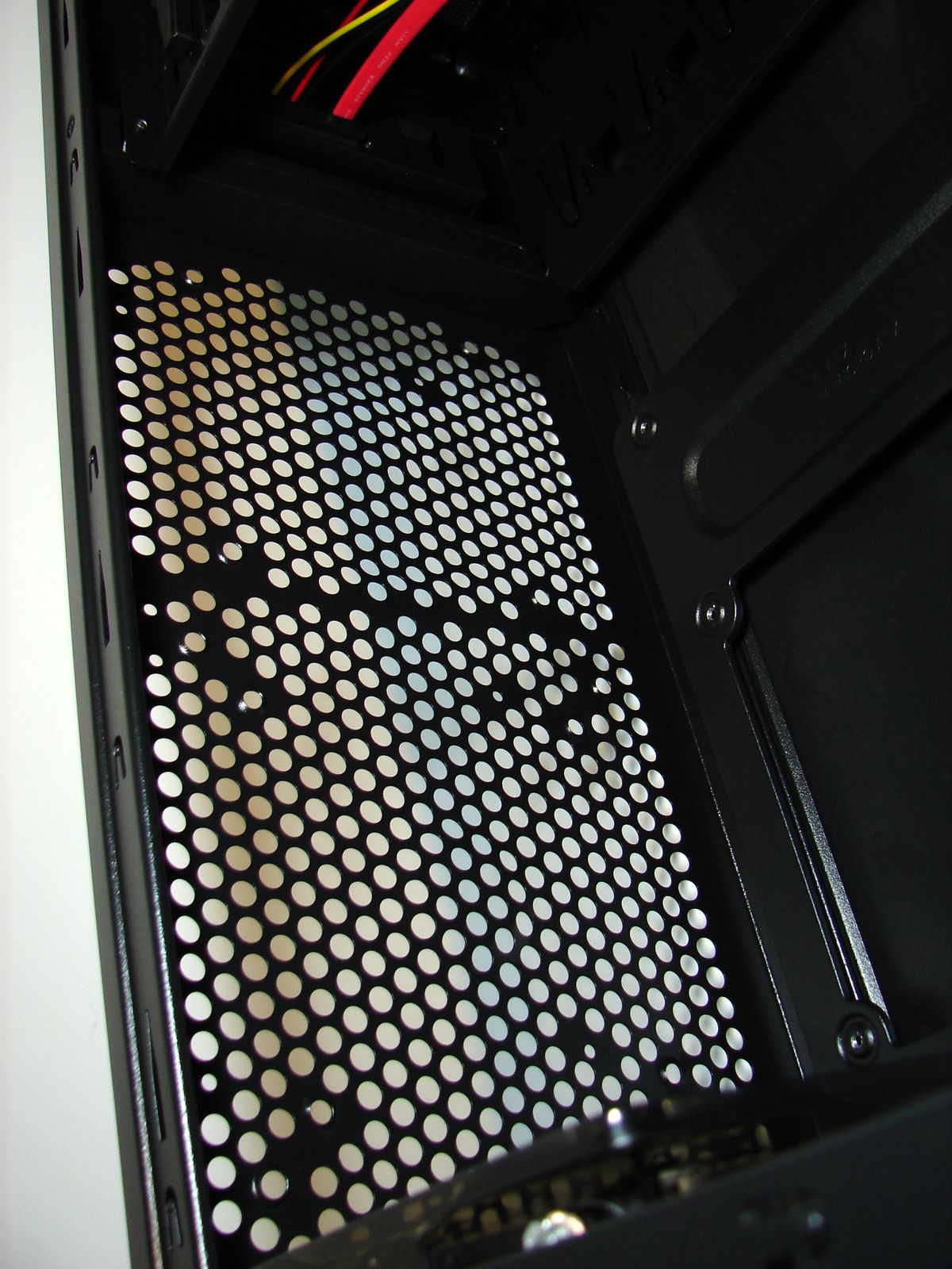 Tray-ul plăcii de bază a fost proiectat pentru a ajuta cât mai mult utilizatorul ce doreşte sa realizeze un cable management bun. De asemenea, se observă că în carcasă încap plăci video de dimensiuni mari, producătorul specificând o lungime maximă pentru acestea de 12.5”. De cealaltă parte a tray-ului, se observă mai uşor că acesta a fost decupat în mai multe locuri, inclusiv în dreptul socket-ului pentru procesor. De asemenea, se mai observă un spaţiu cam mic între tray şi panoul lateral, mai mult spaţiu fiind însa disponibil în zona bay-urilor pentru harddisk-uri.