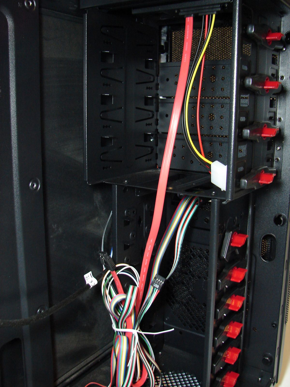 De partea cealaltă a peretelui frontal, se află 7 bay-uri de 2.5”, cele 4 de 3.5: şi mănunchiul de cabluri pentru conectarea panoului frontal şi a cablurilor. Pentru montarea harddisk-urilor şi a unităţilor optice, utilizatorul nu are nevoie să apeleze la şuruburi şi la şurubelniţă, carcasa fiind dotată cu un mecanism propriu de fixare.