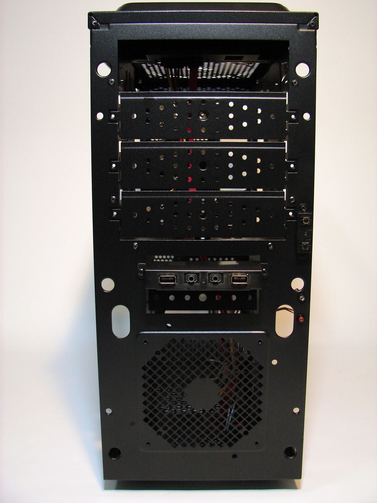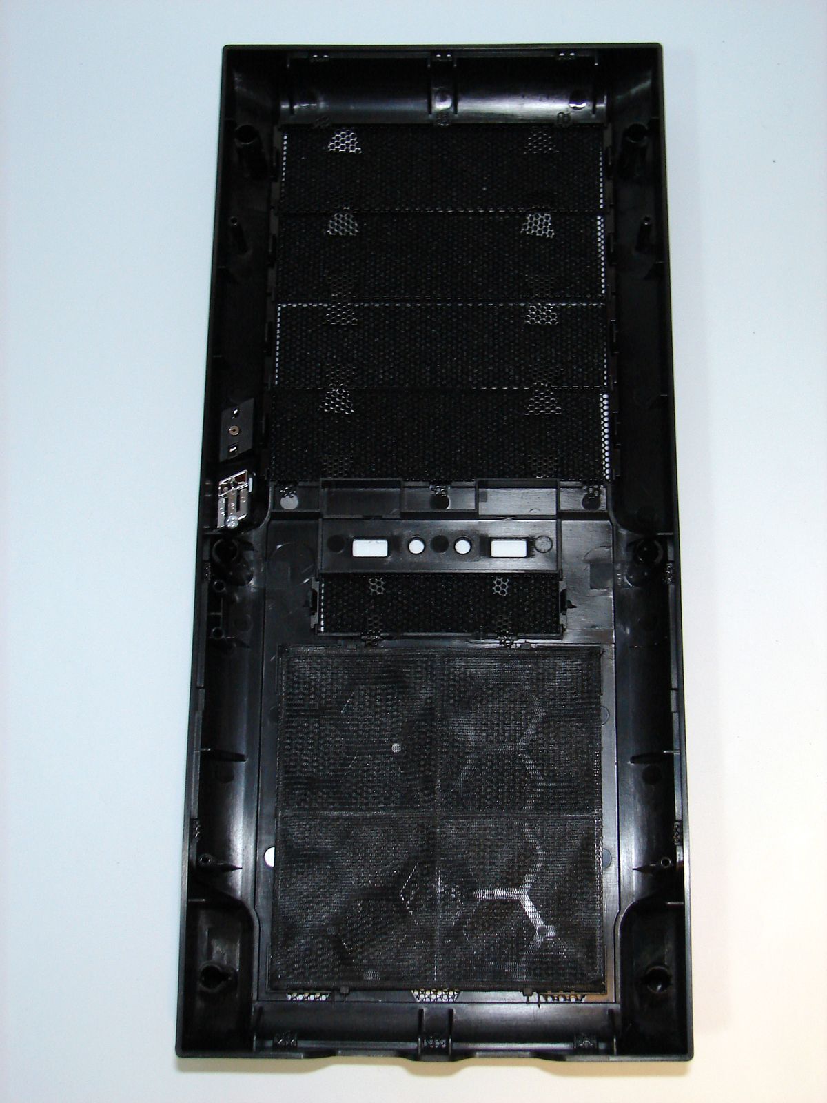 Odată înlăturată masca frontală, se observă o zonă perforată, unde utilizatorul poate monta un ventilator cu diametrul de 120mm. Tot aici se observă cel mai bine şi prezenţa celor 4 bay-uri de 5.25”. De asemenea, mai trebuie spus ca zonele de admisie a aerului rece sunt prevăzute cu filtre pentru praf.