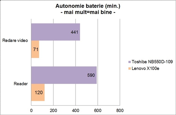 Bateria Li-Ion utilizată de Toshiba are o capacitate de 5600mAh şi oferă o autonomie foarte bună, fie că vorbim despre redarea unui film sau de parcurgerea unor documente.