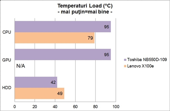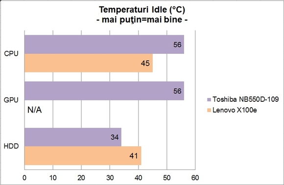 Indiferent de regimul de funcţionare, carcasa netbook-ului s-a menţinut rece, sau cel mult călduţă, pe toate părţile. Cu toate acestea, se observă că APU-ul a atins în sarcină o temperatură destul de ridicată. În plus, nivelul de zgomot produs în cazul unei solicitări intensive este deranjant, turaţia ventilatorului crescând de la 3200RM în Idle la 7800RPM în Load.