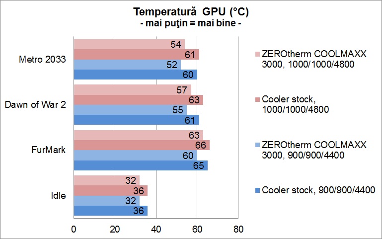 Aşa cum mă aşteptam, ZEROtherm COOLMAXX 3000 este un produs reuşit, cu performanţe bune, chiar dacă design-ul liniştit ascunde în primă fază acest lucru. Aşa cum se poate observa, modelul reuşeşte performanţe mai bune decât soluţia de răcire adoptată de HIS pentru Radeon HD 6790 IceQX Turbo. Şi dacă vi se pare că diferenţa de temperatură nu este tocmai una apreciabilă, atunci poate că ar trebui să aruncaţi o privire şi la testele efectuate cu implementare de referinţă a lui Radeon HD 6790, care funcţiona şi la frecvenţe mai mici.