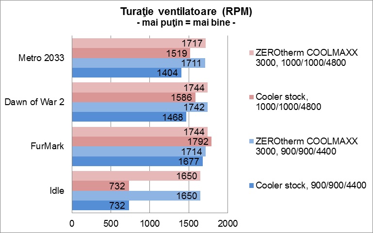 Turaţiile prezentate în imaginea de mai sus nu pot fi comparate între ele din cauza ventilatoarelor diferite utilizate de cele două soluţii de răcire. Chiar şi aşa, puteţi realiza că circa 1700RPM pentru două ventilatoare cu diametrul de 80mm nu pot produce un nivel de zgomot care să deranjeze pe cineva, indiferent cât de pretenţios ar putea fi individul respectiv.